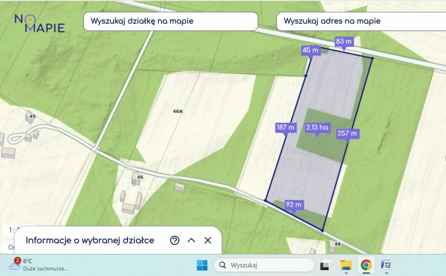 WItam. Sprzedam działkę rolną o powierzchni 2,13haPołożona przy drodze asfaltowej, obok granicy prąd i woda.